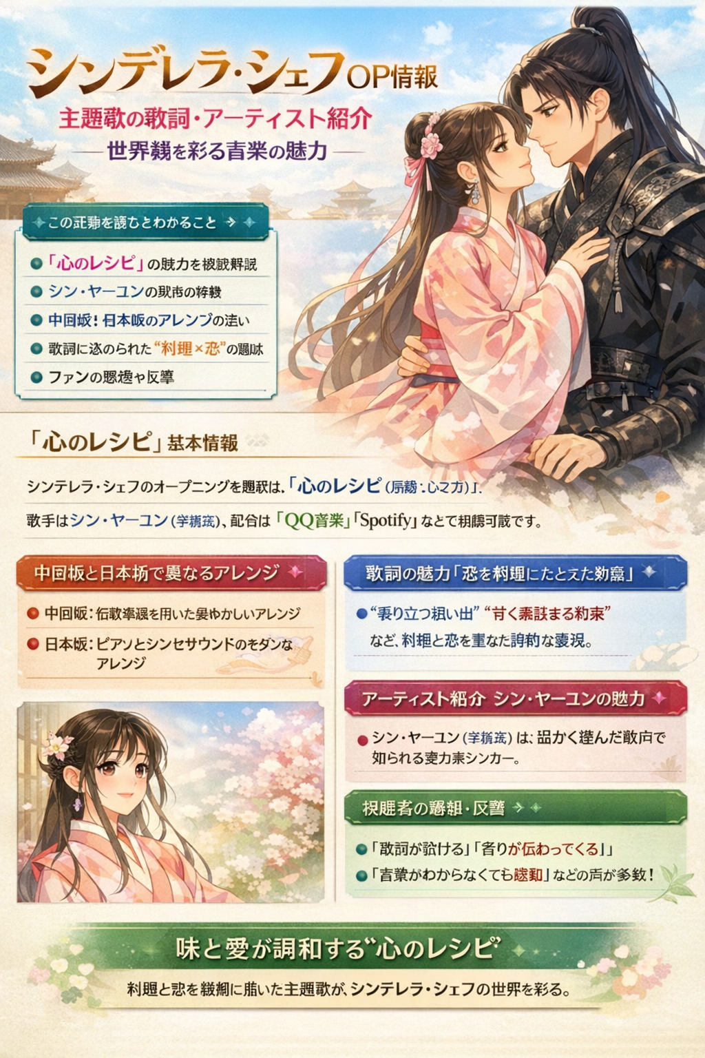 『シンデレラ・シェフ』のオープニング主題歌「心のレシピ(心之方)」は、単なる作品の導入曲ではなく、物語全体の“心”を表現する楽曲です。