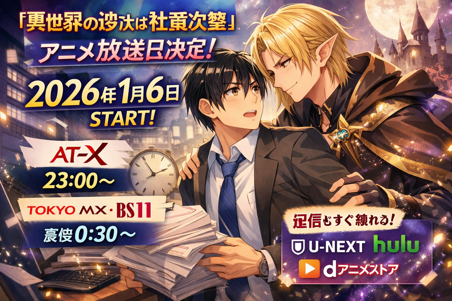BL異世界作品として注目を集めている『異世界の沙汰は社畜次第』のテレビアニメについて、「いつから放送?」「どの放送局で見れる?」「放送時間は何時?」と気になっている方も多いのではないでしょうか。