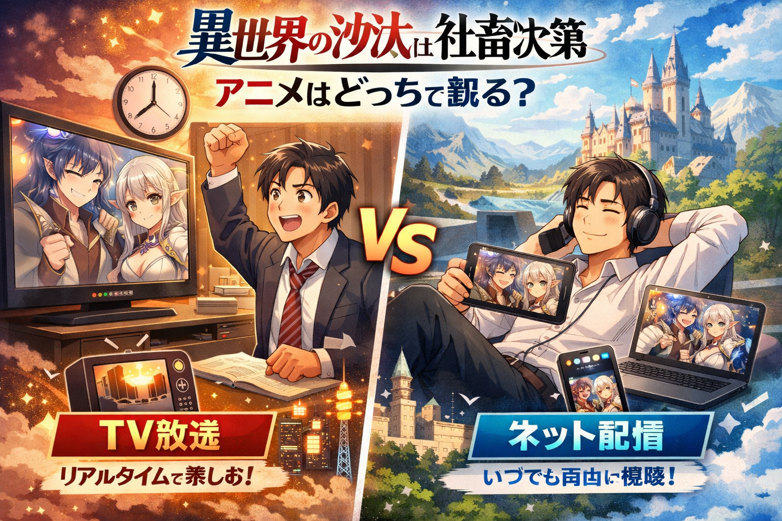 この記事では、異世界の沙汰は社畜次第アニメをTV放送とネット配信で視聴する場合の違いを結論から比較し、それぞれどんな人におすすめなのかをわかりやすく解説します。