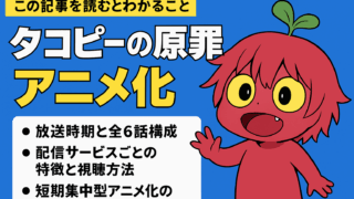 あらすじ紹介 『タコピーの原罪』アニメ化はいつ?放送時期・配信サービス最新情報まとめ 『タコピーの原罪』は、タイザン5による話題作で、衝撃的な展開と深いテーマ性で人気を集めました。そんな『タコピーの原罪』のアニメ化が決定し、放送時期や配信サービスに注目が集まっています。この記事では、『タコピーの原罪』アニメ化がいつから放送さ... 2025.09.12 あらすじ紹介